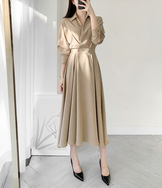 Long Sleeve Collared Plain Double Breasted Midi A-Line Shirt Dress
