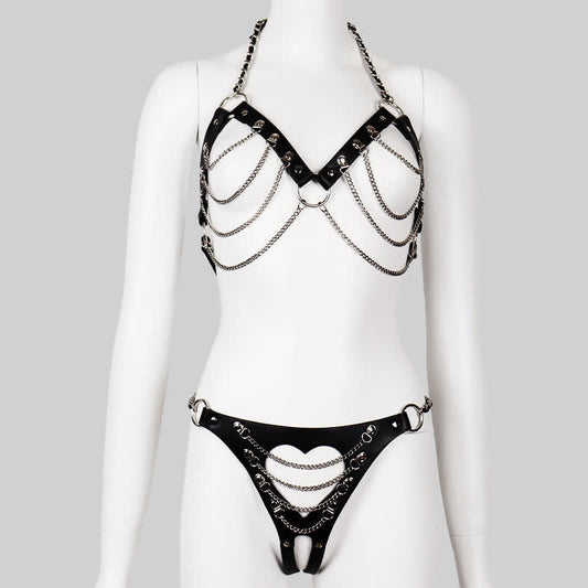 Sexy Halter Chain Hollow Out PU Lingerie Set