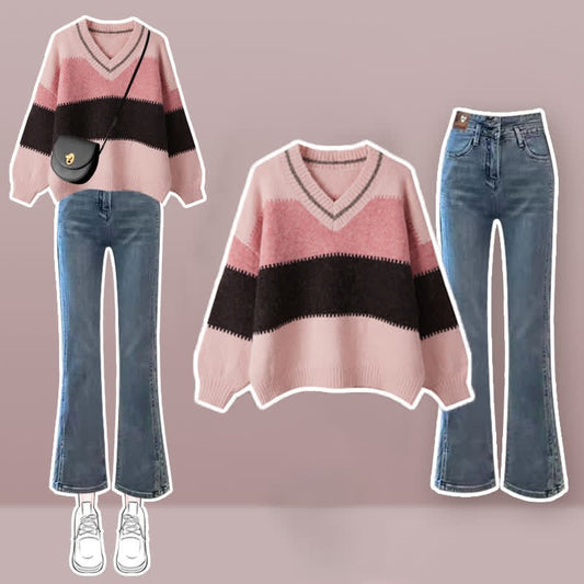 Lapel Pants Stripe Two Sweater Casual Chic Pieces