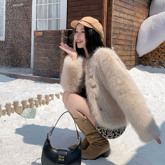 Crew Neck Plain Fluffy Double-Breasted Jacket