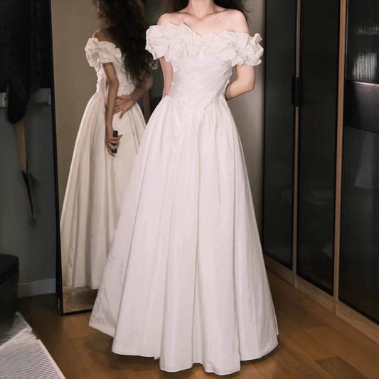 A-Line Off Ruffle Shoulder Trim Gown Evening