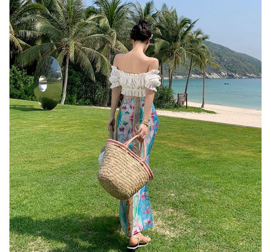 Set: Short-Sleeve Off-Shoulder Floral Crop Top + Mid Rise Maxi Pencil Skirt