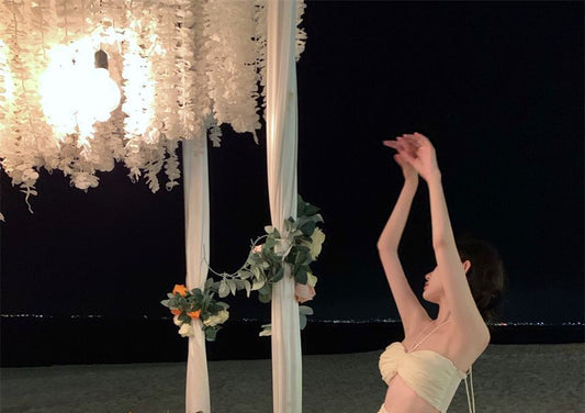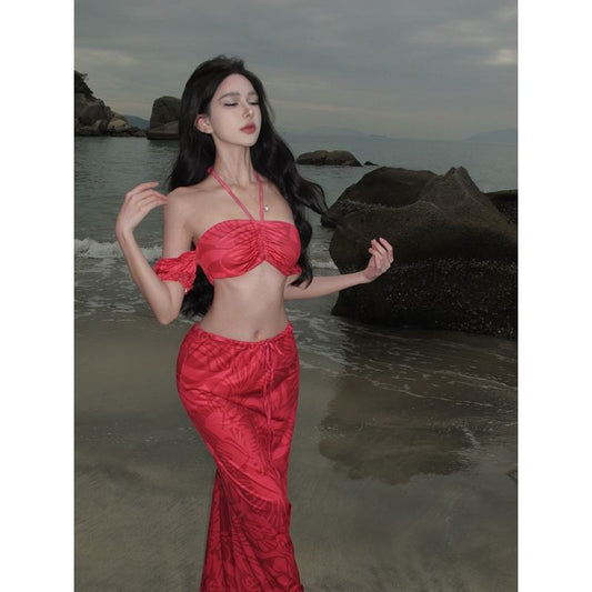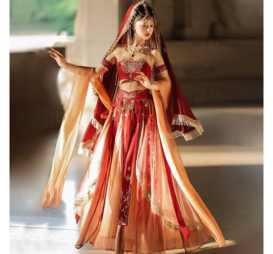Set: trägerloses, besticktes Lolita-Crop-Top + High Rise-Midirock in A-Linie + Armausschnitt + Schal + Schleier