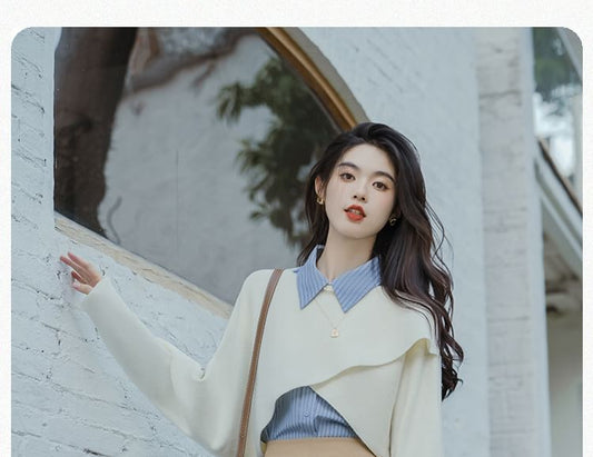 Long-Sleeve Plain Crop Top / Striped Shirt / High Waist Maxi A-Line Pleated Skirt / Set
