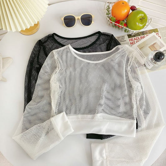 Langärmliges, schlichtes Crop-Top aus Netzstoff mit Rundhalsausschnitt