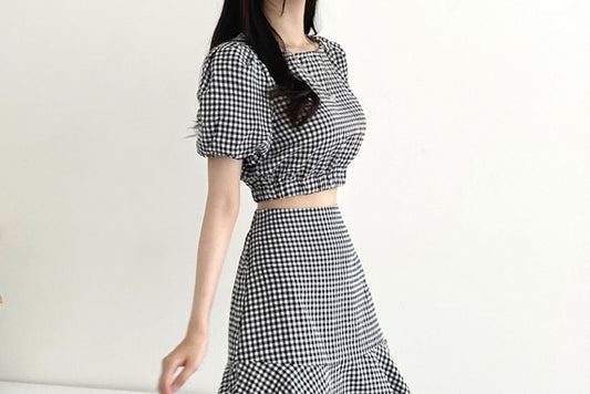 Set: Kariertes Crop-Top mit Puffärmeln und Rundhalsausschnitt + High Rise Midi-A-Linienrock