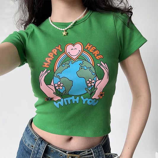 Grünes bauchfreies Top mit Kätzchen im Y2K-Stil