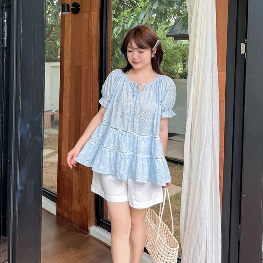 Plus Size Puff-Sleeve Notch Neck Embroidered Perforated Tie Front Blouse