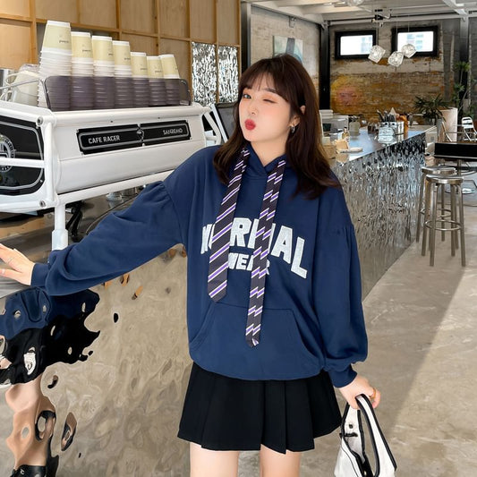 Plus Size Lettering Print Contrast Trim Drawstring Hoodie