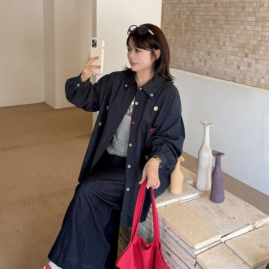 Plus Size Long-Sleeve Button Accent Pocket Detail Oversized Shirt