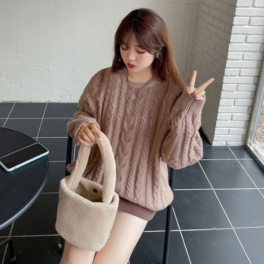 Plus Size Crew Neck Plain Cable Knit Sweater