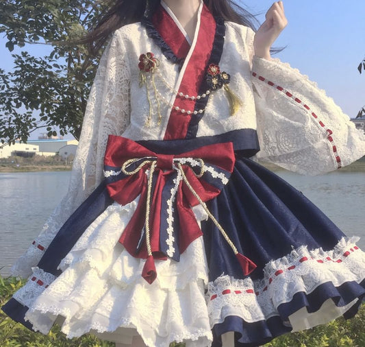 Lolita A-Linien-Overallkleid mit Spitzenbesatz / Langarmbluse / Petticoatrock / Stirnband / Set