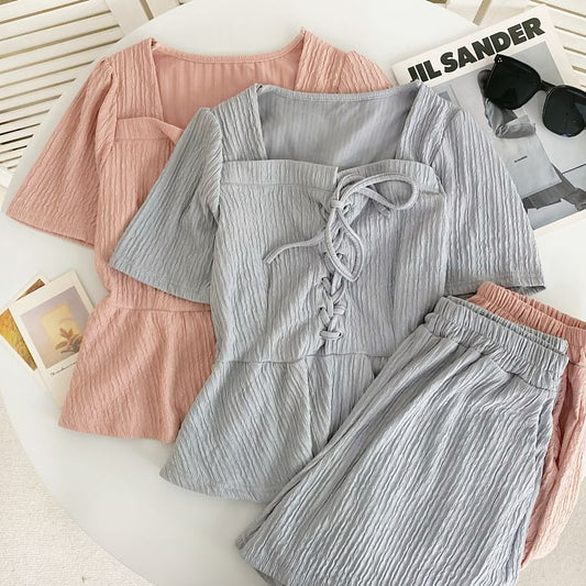 Set: Kurzärmliges Oberteil mit quadratischem Ausschnitt und schlichter Schnürung + Shorts mit elastischer Taille