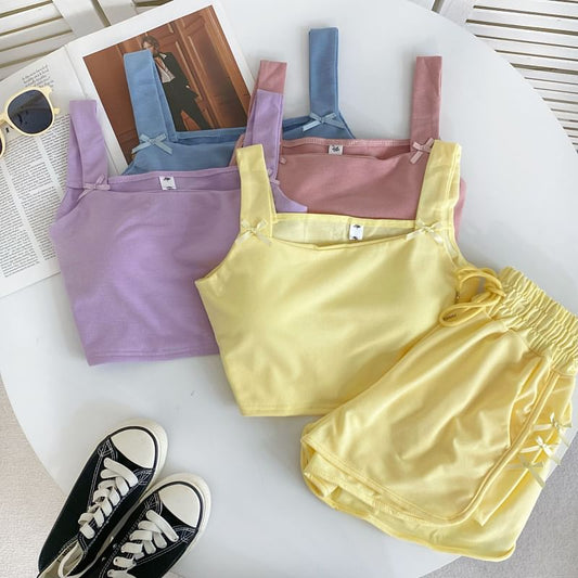 Set: Gepolstertes, kurzes Tanktop mit U-Ausschnitt, Schleife und Stickerei + Sweatshorts mit elastischem Bund