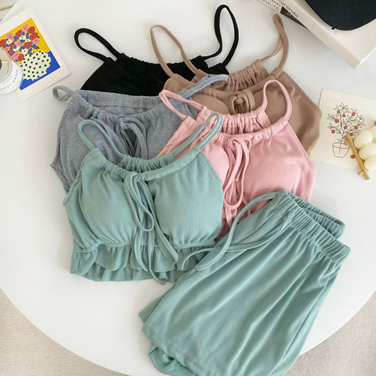 Set: Schlichtes, kurzes Camisole-Oberteil mit Rüschen und Bindeband + Shorts mit Kordelzug in der Taille