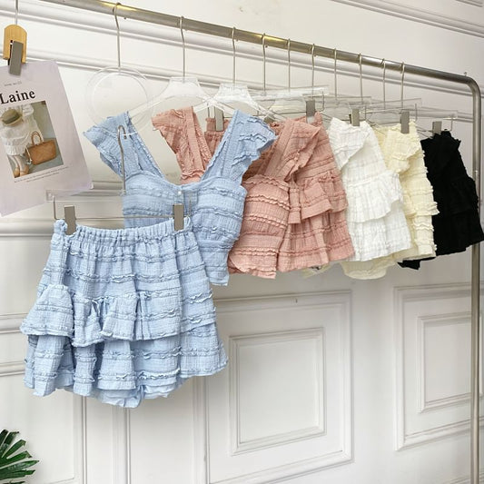 Set: Schlichtes kurzes Camisole-Top aus Spitze + gestufter Minirock in A-Linie mit elastischer Taille
