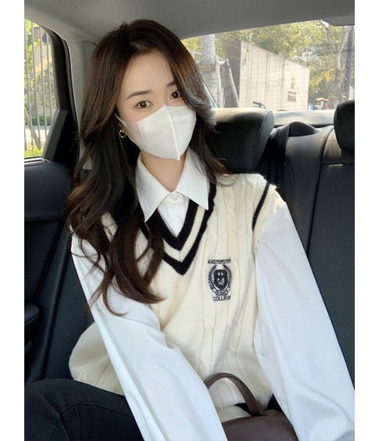 Einfarbiges Hemd mit Kragen / Pullunderweste mit V-Ausschnitt / Einfarbiger Mini-Faltenrock mit hoher Taille