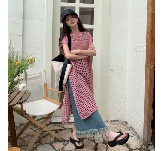 Rundhalsausschnitt, schlicht, Schlitz, Häkel-Langpulloverweste