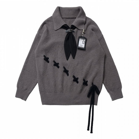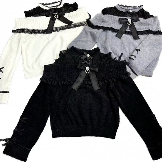 Jirai Kei Grey and Black Illusion Cutout Shoulder Landmine Sweater