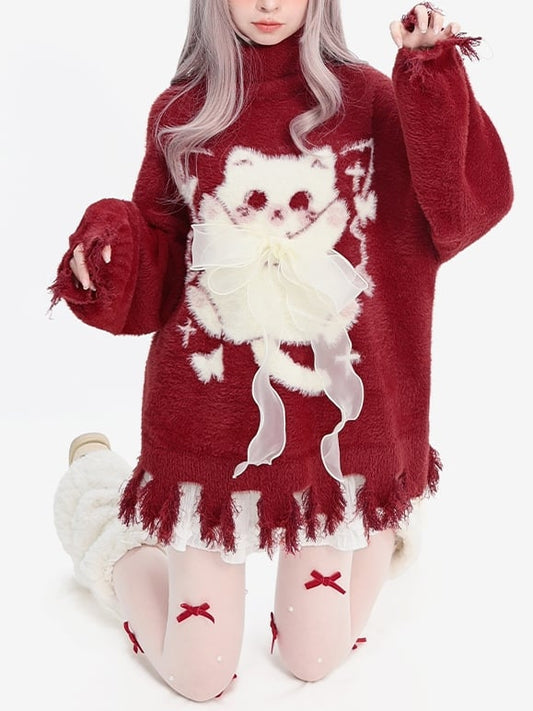 Red Cat Bow Accent Distress Trim High Neck Cozy Sweater