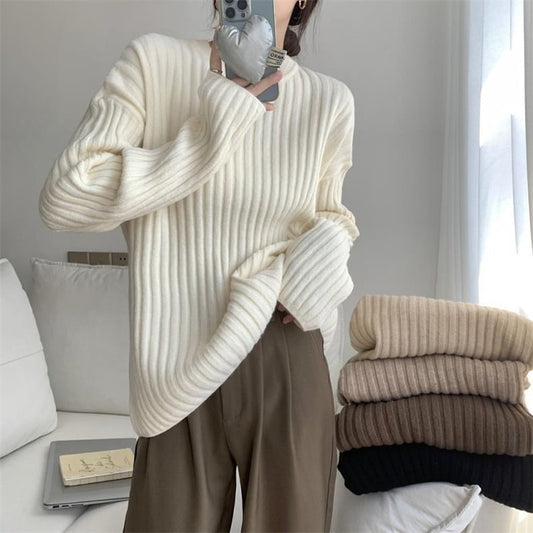 Long Sleeve Off-Shoulder Plain Ribbed-Knit Sweater
