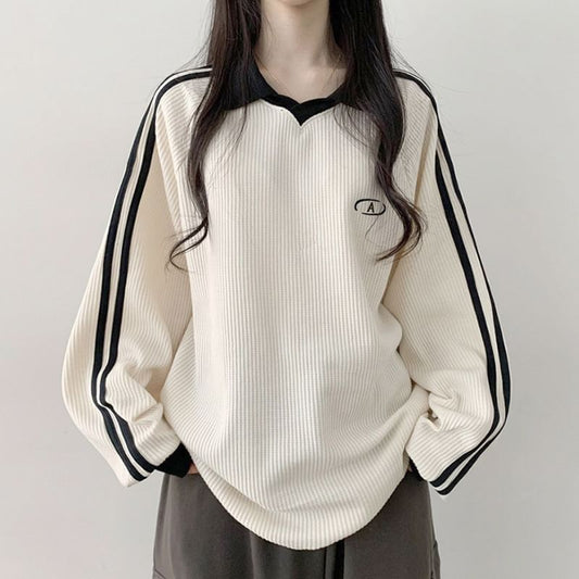 Long Sleeve Contrast-Trim Embroidered Waffle Pattern Loose-Fit Pullover