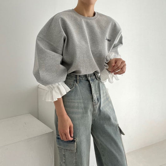 Long Sleeve Cold-Shoulder Graphic & Lettering Print Loose-Fit Pullover / High Waist Loose-Fit Wide-Leg Cargo Pants
