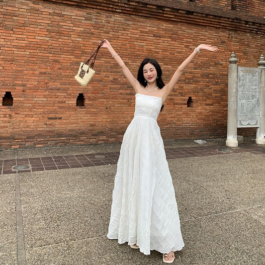Spaghetti Strap Plain Pleated Tie Back Maxi A-Line Dress