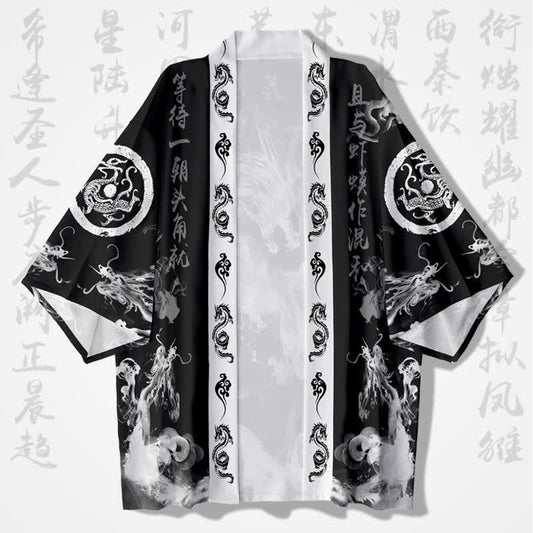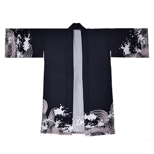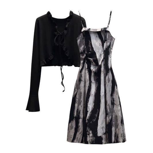 Elegantes schwarzes kurzes Cardigan-Unterkleid mit Tuschemalerei-Print