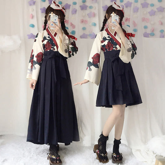 Kimono-Hemd mit Vintage-Rosenblumen-Print und Faltenrock mit Schnürung