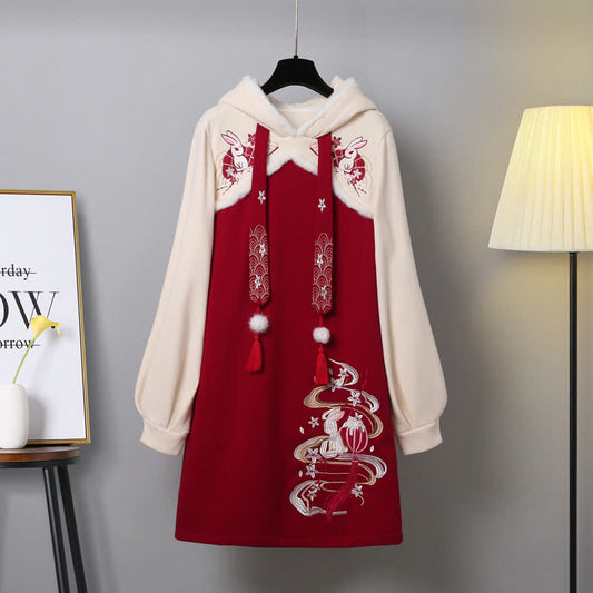 Vintage Red Bunny Colorblock Kapuzen Sweatshirt Kleid