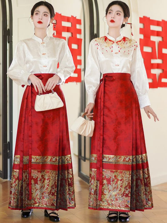 Traditional Chinese Long-Sleeve Print Shirt / High Waist Pleated Skirt