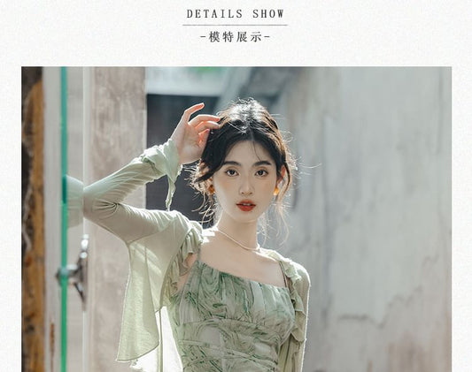 Short-Sleeve Plain Hanfu Top / Long-Sleeve Floral Print Top / Leaf Print Shawl / Spaghetti Strap Pleated Dress