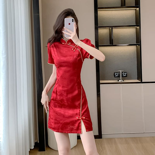 Traditional Chinese Short-Sleeve Stand Collar Faux Pearl Accent Frog Buttoned Slit Mini A-Line Dress
