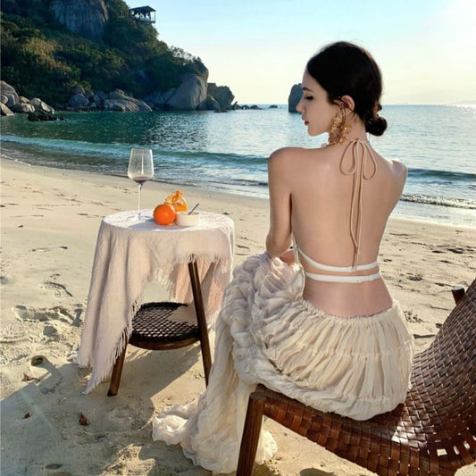 Spaghetti Strap Halter Neck Plain Ruffle Trim Maxi A-Line Dress