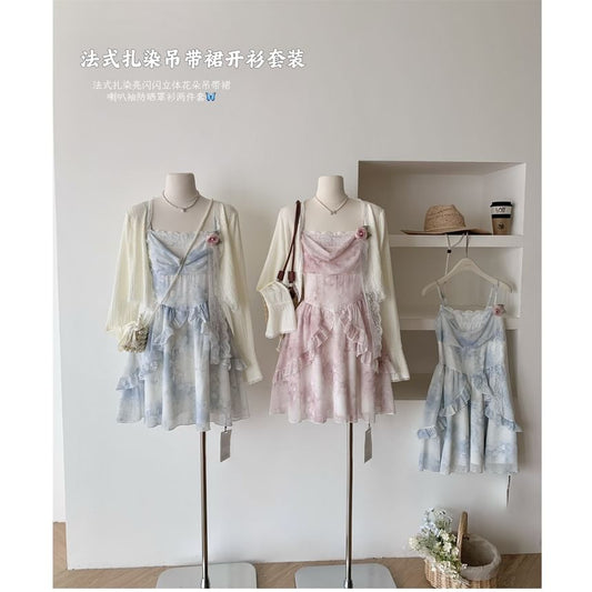 Set: Plain Cardigan + Spaghetti Strap Floral Print Mini A-Line Dress