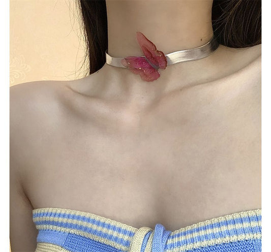 Fringed Choker Rhinestone Butterfly Leather Faux