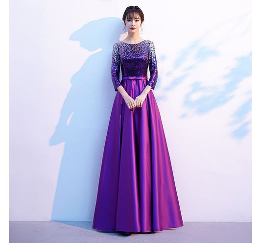 Gown Satin Neck 3/4-Sleeve Plain Evening Sequin A-Line Round