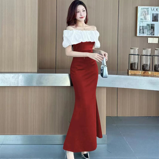 Gown Ruffle Trim Off-The-Shoulder Tone Mermaid Two Evening