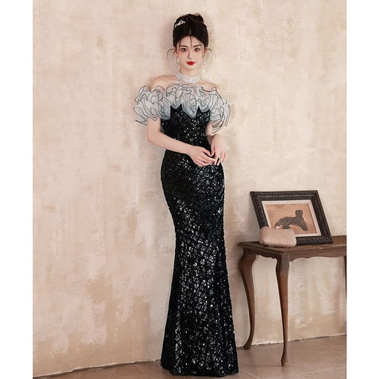 Gown Sequined Off-Shoulder Ruffled Evening Mermaid