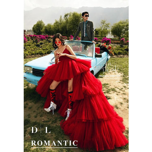 Gown Strap Floral Spaghetti Evening A-Line Applique Mesh V-Neck Tiered
