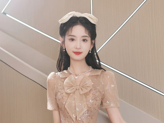 Mesh Glitter Evening Gown Bow A-Line Puff-Sleeve