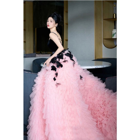 Panel Floral Strap Tone Mesh A-Line Two Gown Applique Spaghetti Evening Tiered