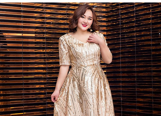 Plus A-Line Short-Sleeve Shiny Size Gown Evening V-Neck
