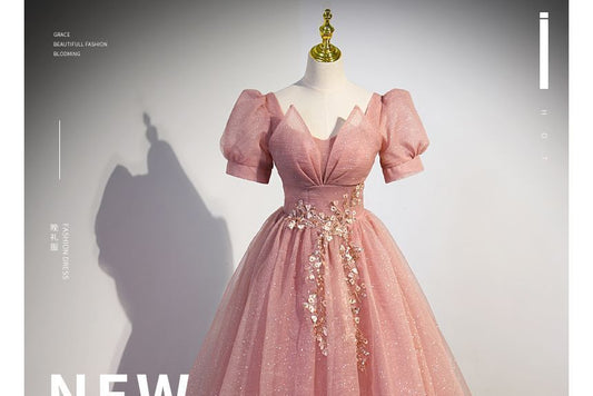 Puff-Sleeve Embellished Bow A-Line Prom Dress