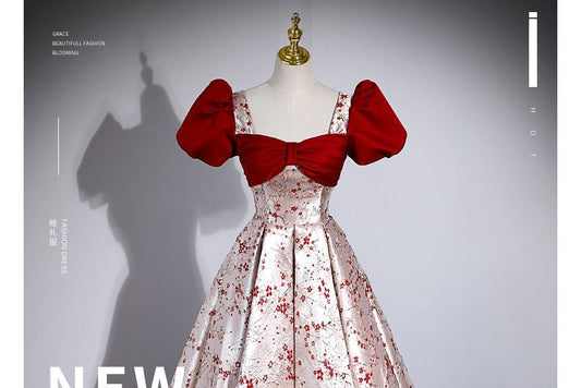 Puff-Sleeve Floral Print Bow A-Line Evening Gown