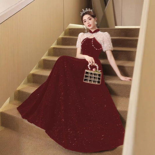 Puff-Sleeve Sequin Rhinestone A-Line Evening Gown