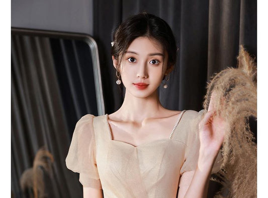 Puff Sleeve Square Neck Plain Beaded Ruched Panel Mesh A-Line Evening Gown