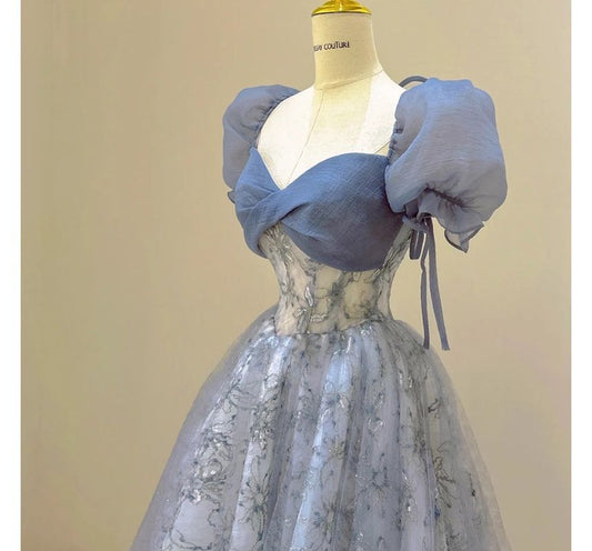 Puff-Sleeve Flower Embroidered Sequin A-Line Evening Gown