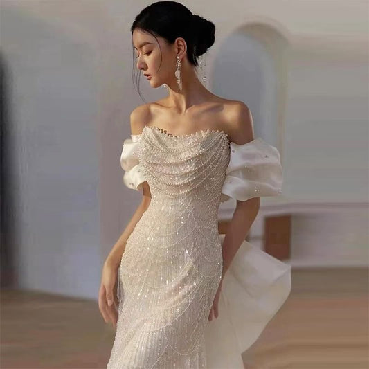 Sequined Rhinestone Evening Gown Mermaid Puff-Sleeve
